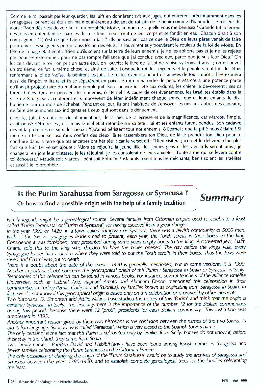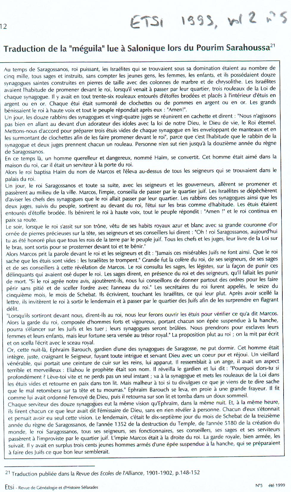| Nous publions ici une traduction de cette Méguilah parue dans la revue de généalogie ETSI Vol 2 N° 5 de 1999, à la fin d'une étude de Mme Laurence Abensur-Hazan, reprenant la traduction de la Revue des Ecoles de l'Alliance 1901-1902 p 148-152. |